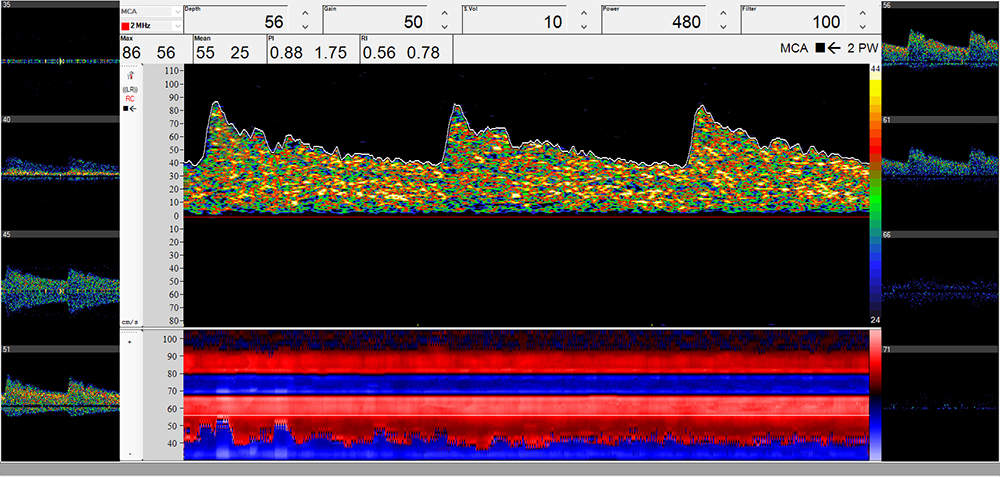 As a non-invasive examination method, the “Routine Doppler” is primarily used to diagnose transcranial, extracranial and peripheral vascular diseases. It is also receiving increased attention for invasive surgical measures. In this process, the user notably obtains valuable information about blood flow velocity and any changes thereto, vascular resistance, the peak systolic velocity, the direction of blood flow and significant differences between both sides. This allows safe and fast detection of the finest vessels even in the case of neurosurgical operations.